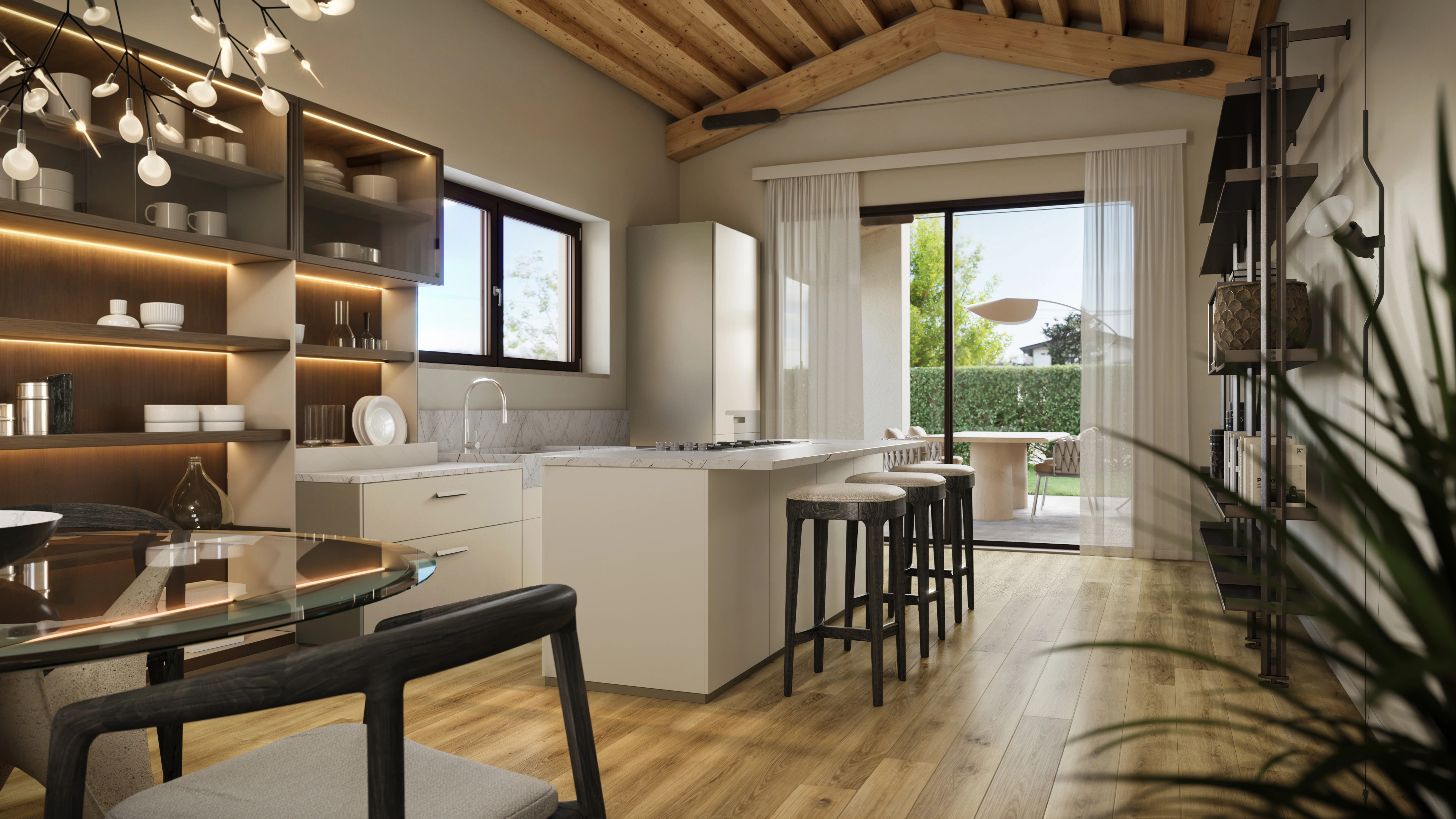 Le abitazioni si sviluppano su un unico piano, con una distribuzione razionale e armoniosa degli ambienti. Il cuore pulsante della casa è la zona giorno open space, ampia e luminosa, con una grande vetrata alzante scorrevole che si apre direttamente sul giardino. Questo dialogo continuo tra interno ed esterno consente di vivere in piena connessione con la natura circostante, regalando luce, aria e bellezza a ogni momento della giornata.