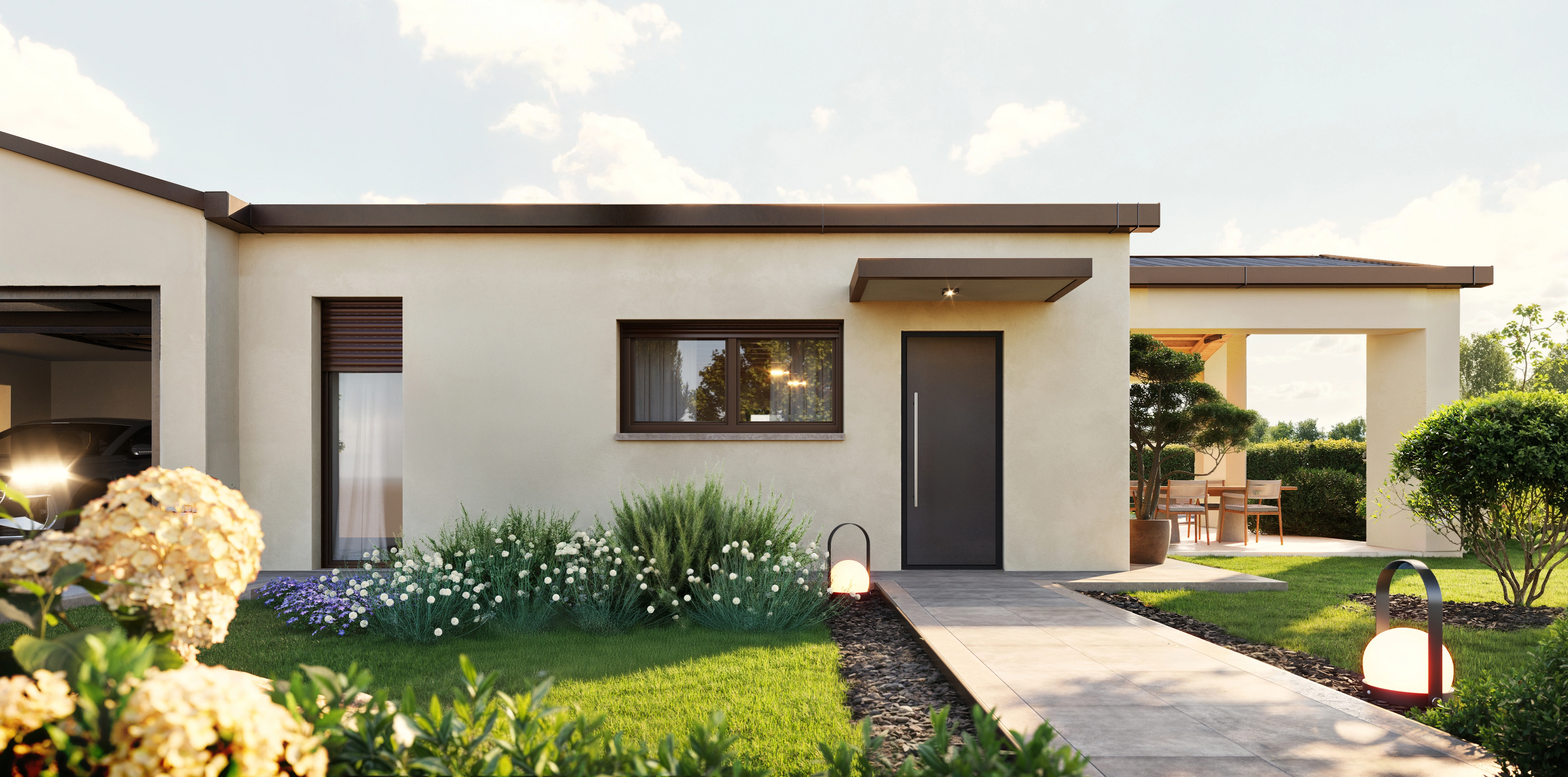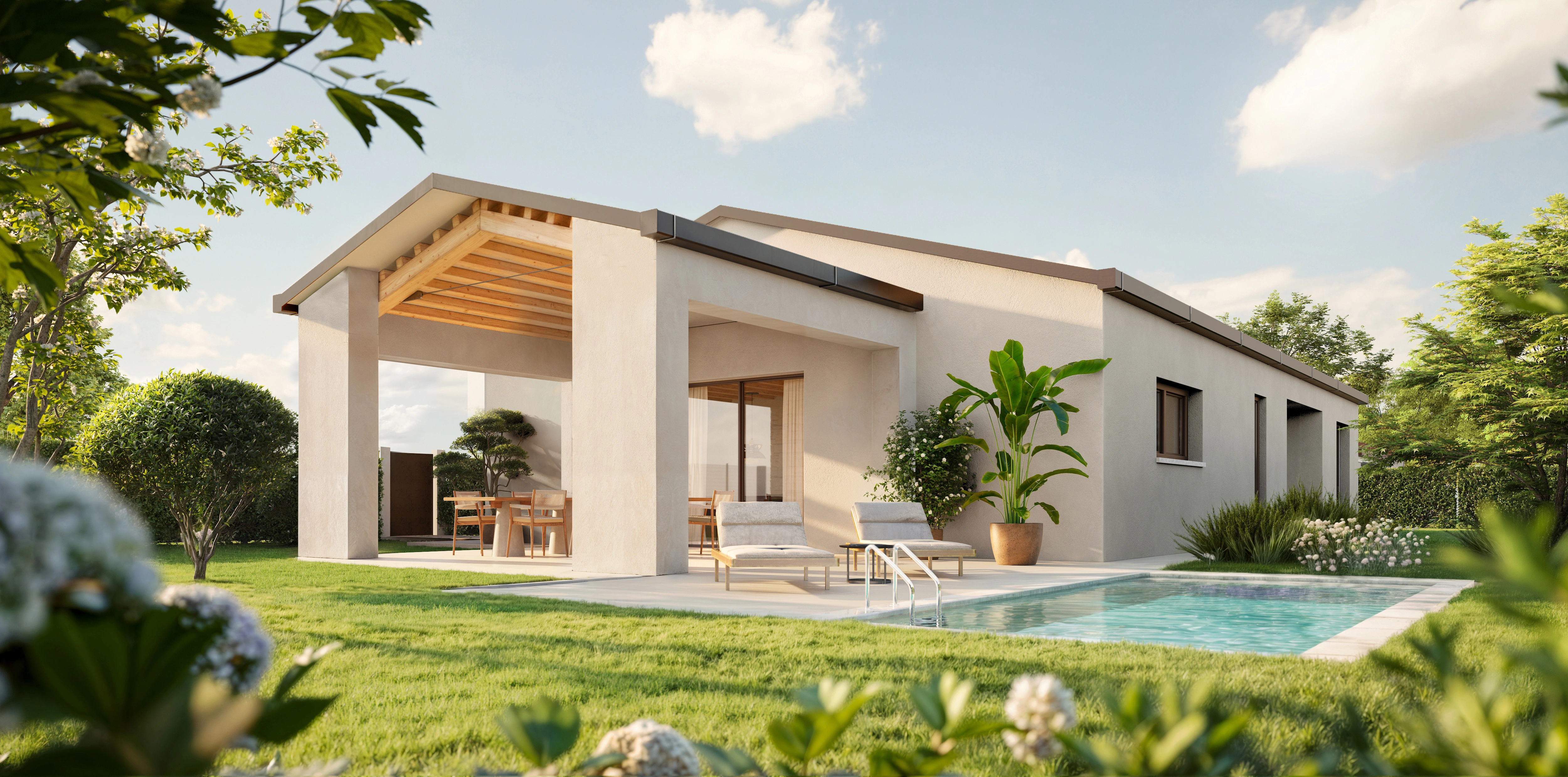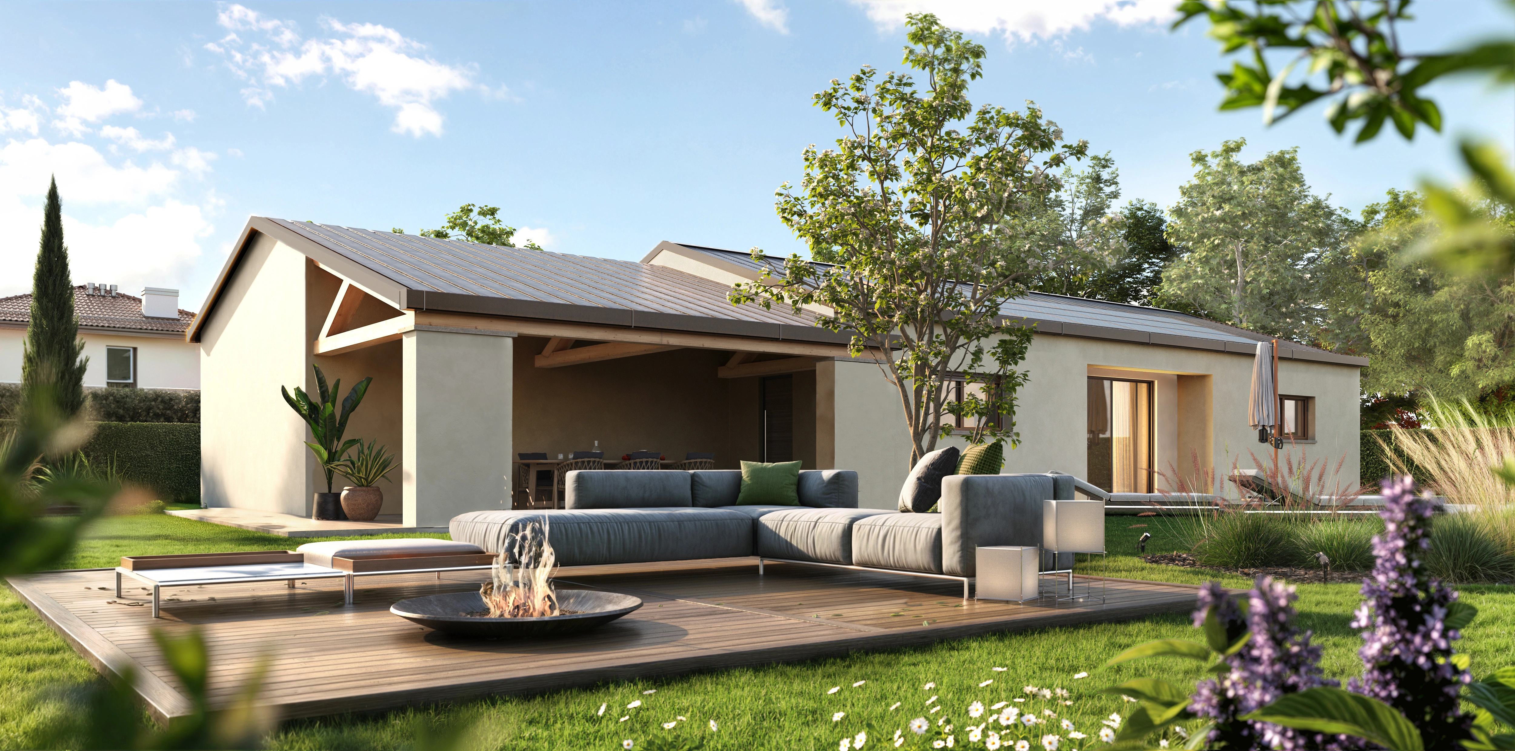 Le abitazioni si sviluppano su un unico piano, con una distribuzione razionale e armoniosa degli ambienti. Il cuore pulsante della casa è la zona giorno open space, ampia e luminosa, con una grande vetrata alzante scorrevole che si apre direttamente sul giardino. Questo dialogo continuo tra interno ed esterno consente di vivere in piena connessione con la natura circostante, regalando luce, aria e bellezza a ogni momento della giornata.